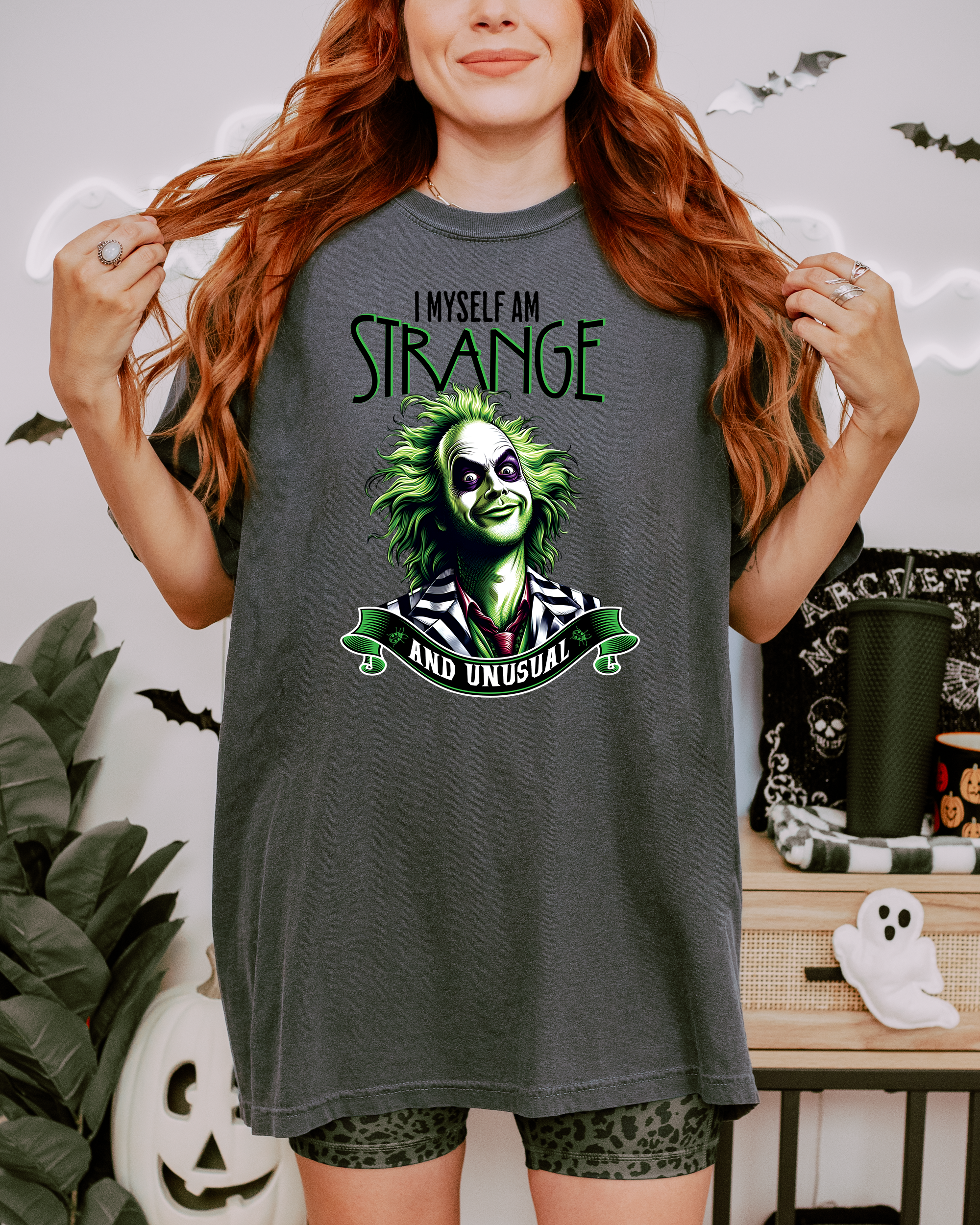 Add a touch of Beetlejuice's unique charm to your creations with this eye-catching DTF transfer. Featuring the iconic phrase "I myself am strange and unusual," this ready-to-press design is perfect for customizing tees, tote bags, and more. Just press on and enjoy the distinctive flair it brings to your projects!