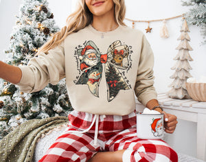 Get ready to sleigh the holiday season in this whimsical Christmas Bow sweatshirt! Wrapped inside an oversized festive bow, you'll find a delightful cast of characters—jolly Santa, a cheerful snowman, a prancing reindeer, and a twinkling Christmas tree—all celebrating together. This playful design brings maximum holiday magic to your everyday look, perfect for ugly sweater parties, family gatherings, or anyone who loves spreading seasonal cheer. Crafted from soft, cozy fabric, it's your ticket to becoming the most festive person in the room. Unwrap the joy this winter!