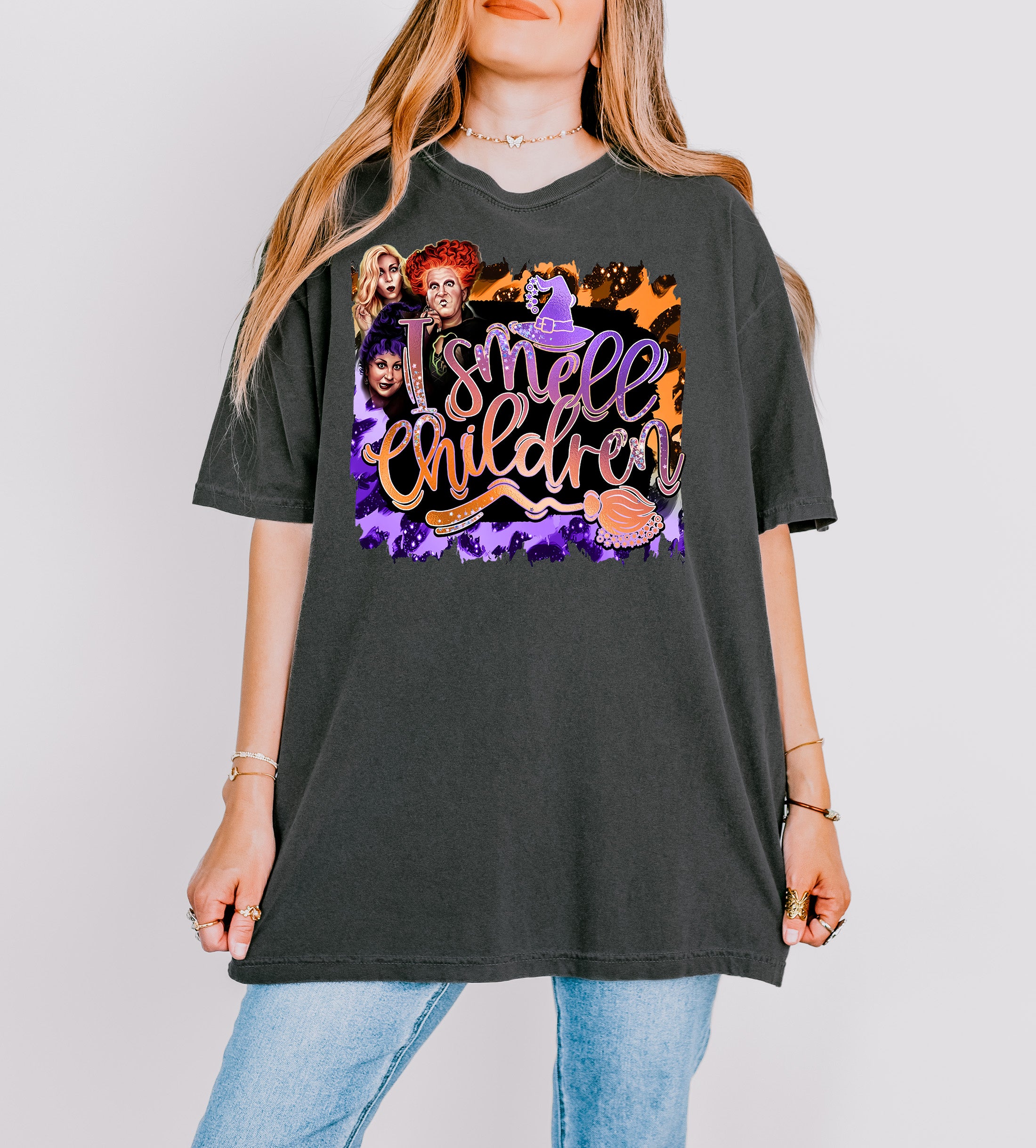 Transform any shirt into a wickedly fun statement with our DTF Transfer - I Smell Children! Embrace your inner witch with this quirky transfer that adds playful humor to any outfit. Perfect for Halloween or just showing off your love for all things spooky.