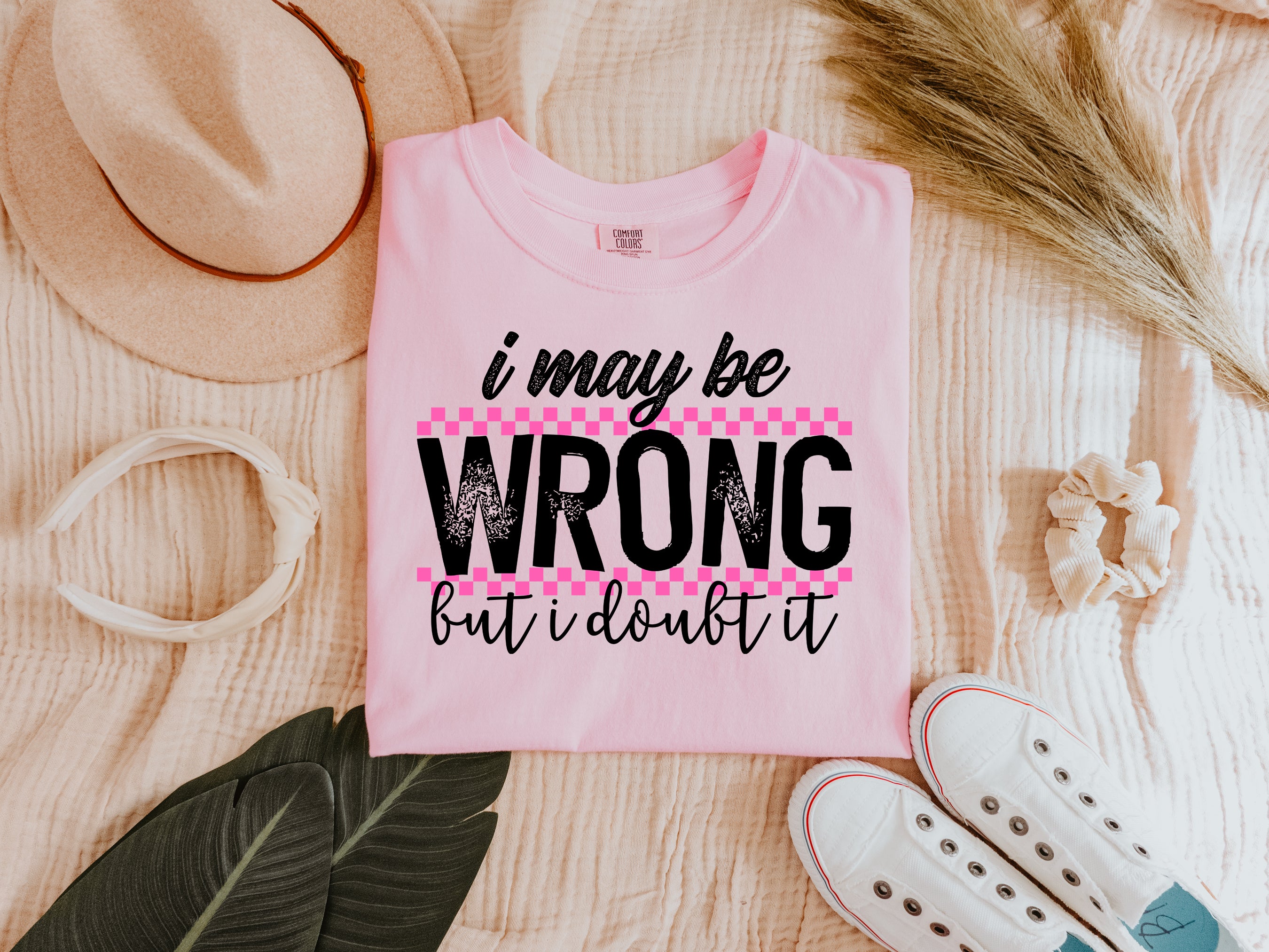 Show off your playful side with 'I May Be Wrong But I Doubt It'! This unique product features DTF transfer for a bold and quirky look. Don't be afraid to make a statement with this fun and playful design. Order yours today!