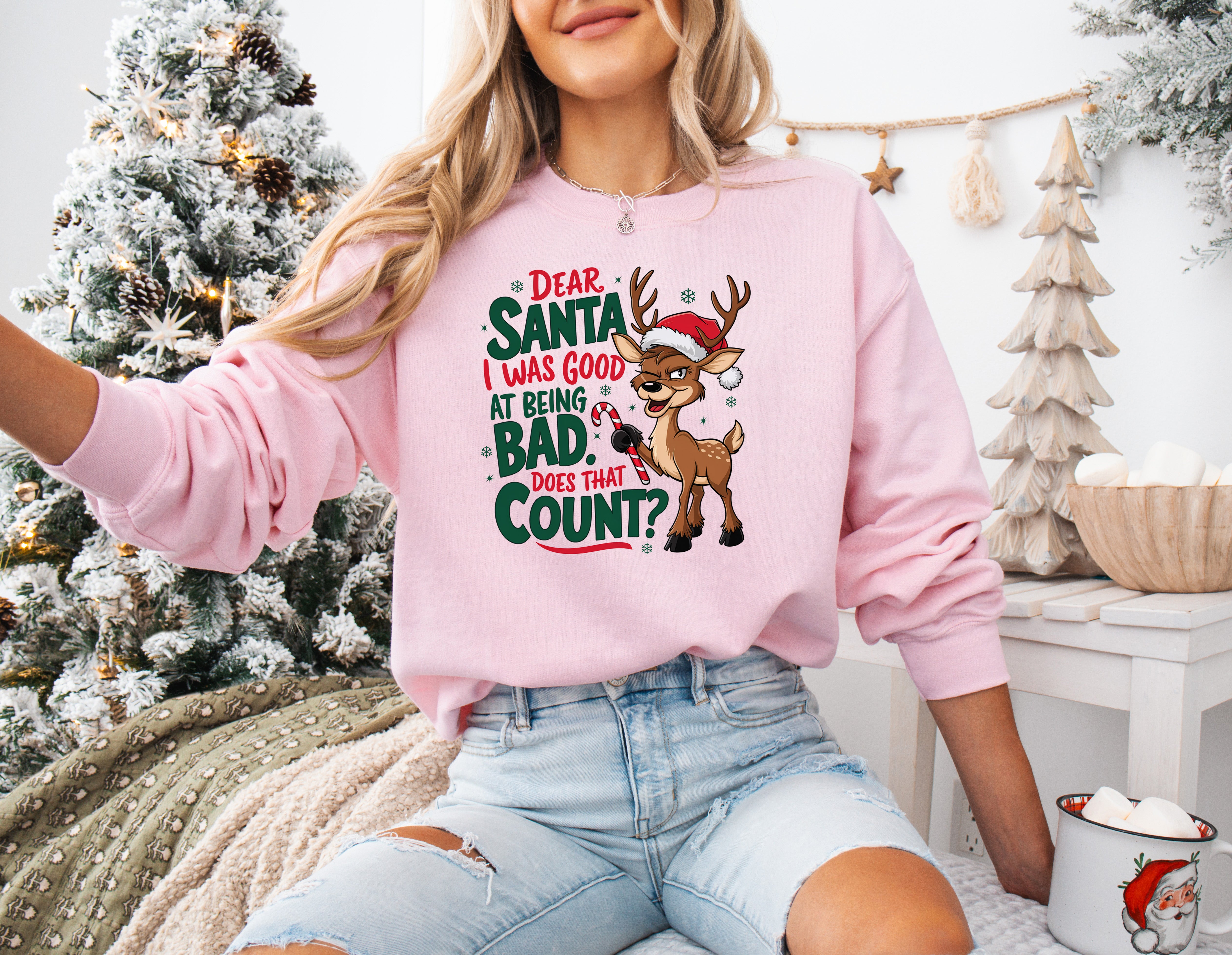 Santa's favorite gift for the naughty ones! With "Dear Santa I was Good at being bad" printed on the front, this design is perfect for those who dare to be a little naughty. Featuring a DTF transfer, make a statement this holiday season. Get yours now!